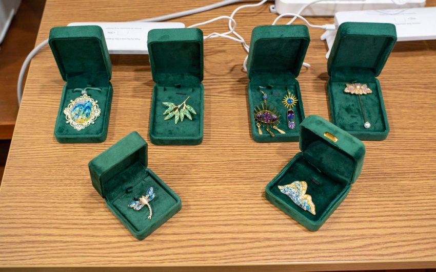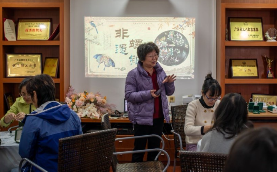 随后,特邀讲师开始为大家详细讲解螺钿工艺的历史渊源和制作技巧。五彩斑斓的螺钿片在光影的映照下闪烁着迷人的光泽,一枚枚精致的螺钿胸针在她们的巧手下初现雏形。在制作过程中,大家还互相交流经验、分享创意,现场气氛融洽而和谐。