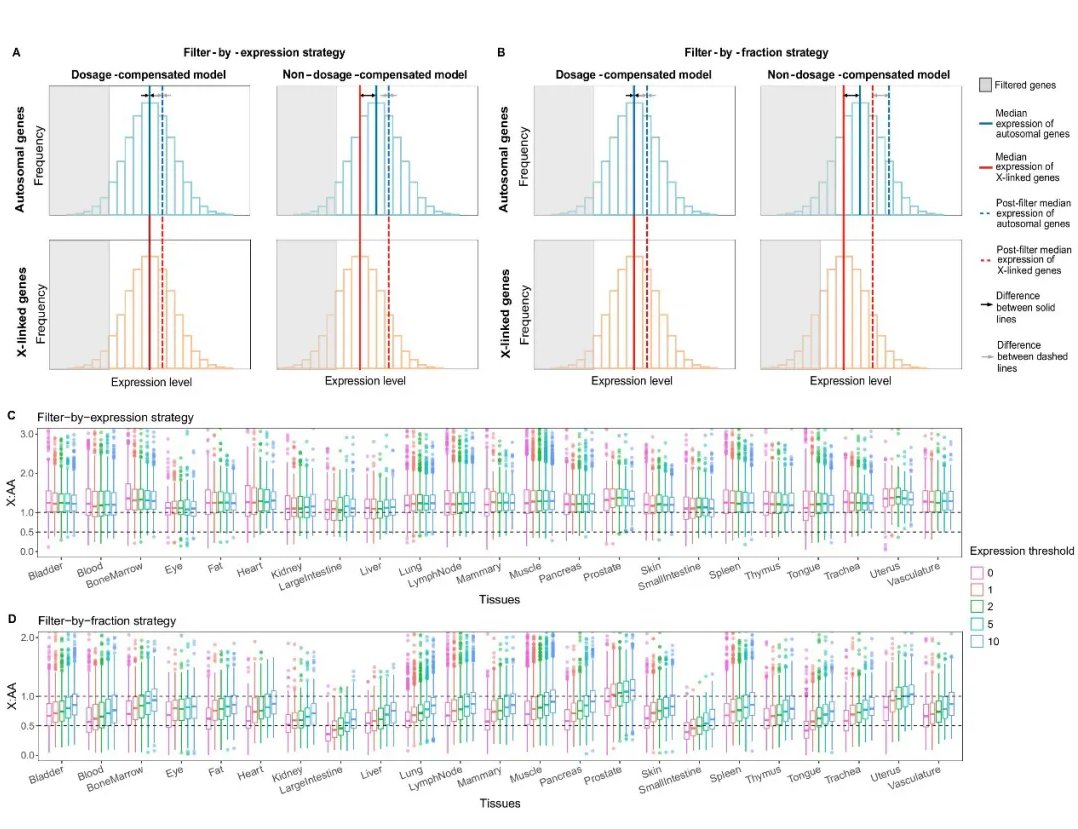 The researchers first used simulated scRNA-seq and bulk RNA-seq datasets to evaluate two common X:AA gene selection strategies, namely filtering by gene expression level and filtering by gene expression proportion. They found that both strategies would generate exaggerated X:AA expression ratios, thus artificially supporting the dosage compensation model.