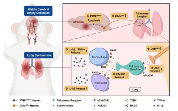 研究团队采用经典的大脑中动脉阻塞(MCAO)模型开展实验,发现大鼠在缺血性卒中后出现肺炎及肺功能障碍。进一步通过临床回顾性分析,团队比较了急性缺血性脑卒中患者与健康对照者的24小时心率变异性(HRV)指标,结果显示卒中患者存在自主神经平衡障碍,具体表现为副交感神经活性显著降低,该现象在动物模型中也得以验证。基于上述结果,研究团队发现了一条以“PVNCaMKII→DMVACh→肺副交感神经节→免疫细胞”为核心的脑-肺副交感轴调控通路,不仅系统阐释了卒中相关肺炎的神经免疫机制,还提出了多个潜在干预靶点,为卒中后肺部并发症的早期防治提供了理论依据和可行路径。该脑-肺轴新框架的建立,拓展了对卒中系统性影响的认识,对推动神经—免疫—器官交互机制的研究具有重要科学价值,并为未来跨学科治疗策略的研发奠定了坚实基础。