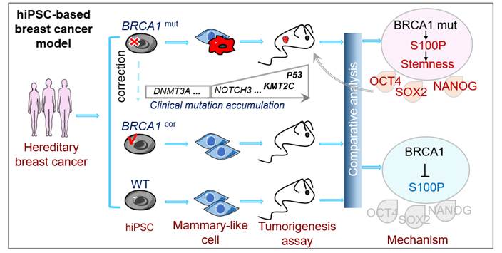 2025年7月25日,笔趣阁 干细胞与组织工程教育部重点实验室丁俊军团队在Science Advance发表了题为Human iPSC-based breast cancer model identifies S100P-dependent cancer stemness induced by BRCAl mutation的研究成果。该研究中,开发了一个新的乳腺分化方法,用于从人类诱导多能干细胞(iPSCs)中生成功能性乳腺样细胞(Mammary-like Cells, MCs )。基于这种分化方法,利用携带生殖系BRCA1突变的患者衍生的iPS细胞构建了乳腺癌模型。这是首个人源的iPS细胞乳腺癌模型,可用于研究肿瘤发生发展机制并寻找潜在的治疗靶点。