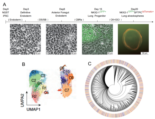 杨建荣教授团队成员利用体外诱导分化系统,对肺胚胎发育早期原始肺祖细胞形成阶段进行了模拟,同时在细胞中加入经过优化的scGESTALT细胞谱系追踪系统,成功测定了群体中50%细胞的单细胞转录谱及其细胞谱系条码,并构建出四个样品的细胞谱系树。