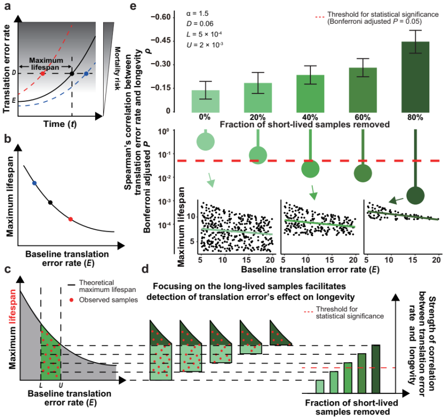 团队前期研究发现翻译错误具有多种功能效应且变化范围受进化限制。通过重新审视奥格尔的错误成灾数学模型(图1a/b),研究揭示当寿命受其他致死因素调控且错误率变化受限时,翻译保真度与寿命的相关性在短寿个体中难以显现;而在长寿个体中因其他致死因素影响减弱,该相关性变得显著(图1c/d)。计算机模拟验证了模型的可靠性(图1e)。这一发现为理解翻译保真度与衰老的关系提供了重要理论依据。