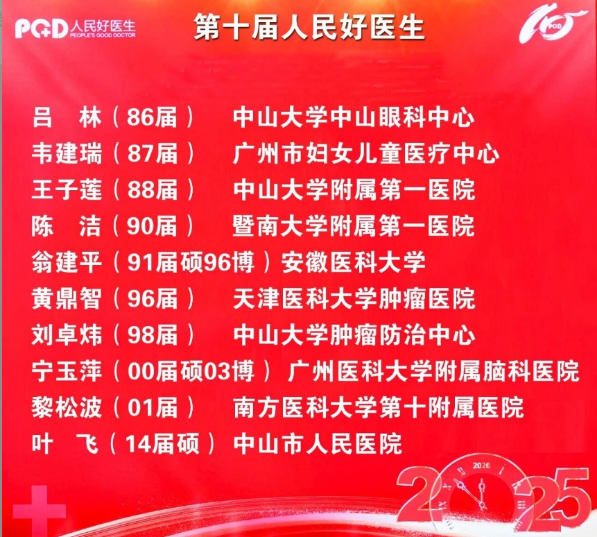 2026年1月17日,2025(第十届)人民好医生致敬典礼暨《2024~2025人民好医生跟诊记》发布仪式在北京举行。中山医多位校友荣膺本届“人民好医生”称号,包括:吕林(86届本科、95届博士)、韦建瑞(87届本科、94届硕士)、王子莲(88届本科、98届博士)、陈洁(90届)、翁建平(91届硕士、96届博士)、黄鼎智(96届)、刘卓炜(98届本科、00届硕士、06届博士)、宁玉萍(00届硕士、03届博士)、黎松波(01届)、叶飞(14届硕士)黄晓军、陈勇、陈敏山、刘幼硕、罗克强等校友获“十年‘优秀推委会’专家”称号。此外,人民好医生代表王宁利、郑敏翠、罗克强、赵维纲、柏斗胜等中山医校友受邀出席了本次大会,黄晓军校友特地为大会录制了祝贺视频