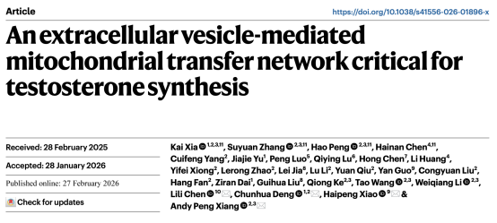 项鹏教授团队,联合附属第一医院肖海鹏教授、邓春华教授、附属口腔医院陈莉莉教授团队,在国际权威期刊《Nature Cell Biology》发表了一项研究,首次揭开了这个谜底。他们发现,睾丸内存在一个由细胞外囊泡介导的、精妙的 “双向线粒体转移网络”。