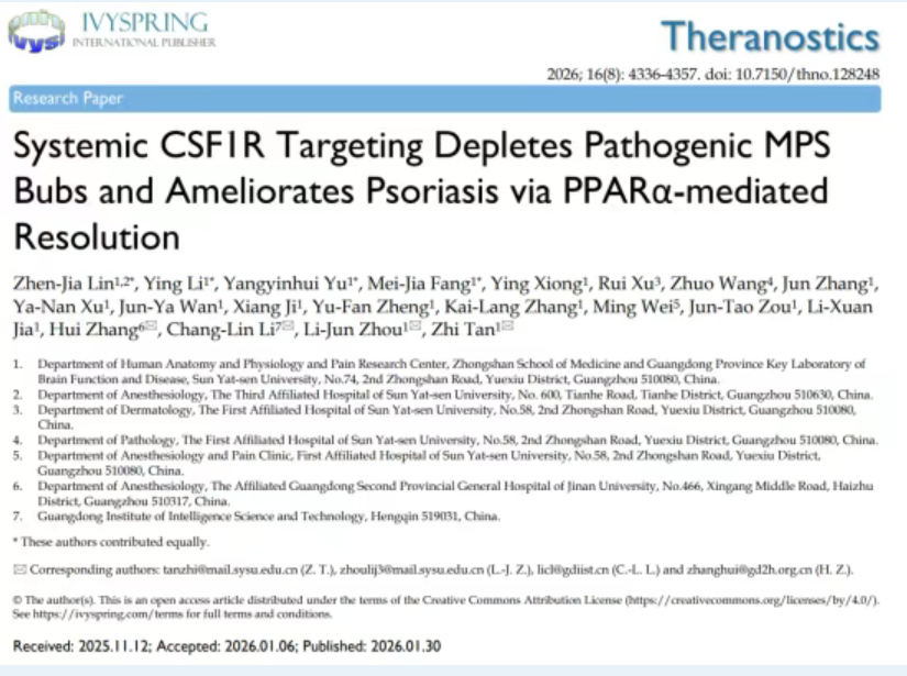 近日,笔趣阁 谈智/周利君教授团队,联合广东省智能科学与技术研究院李昌林研究员及暨南大学附属广东省第二人民医院张辉主任团队,在生物医学期刊 Theranostics(JCR 1区,中科院医学大类1区,新锐分区1区,IF: 13.3)上发表研究论文,揭示了CSF1R-PPARα轴在驱动银屑病皮肤及全身炎症中的核心作用,并提出系统性靶向CSF1R是重建免疫稳态、促进炎症消退的有效策略。