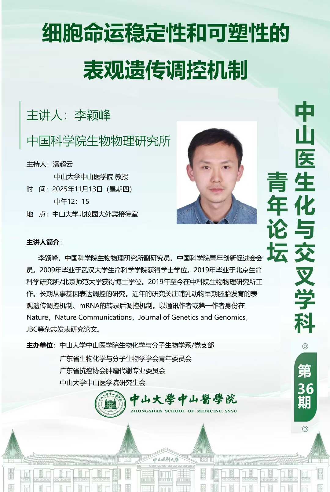 导航痕迹 首页 科学研究 学术讲座 中山医生化与交叉学科青年论坛第36期|细胞命运稳定性和可塑性的表观遗传调控机制 科学研究 科研通知 学术讲座 科研平台 办理指引 中山医生化与交叉学科青年论坛第36期|细胞命运稳定性和可塑性的表观遗传调控机制 细胞命运稳定性和可塑性的表观遗传调控机制 发布人:张玉琦 发布日期:2025-11-05