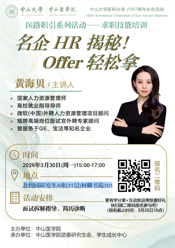 导航痕迹 首页 科学研究 学术讲座 医路职引系列活动--求职技能培训 名企HR揭秘!Offer轻松拿 科学研究 科研通知 学术讲座 科研平台 办理指引 医路职引系列活动--求职技能培训 名企HR揭秘!Offer轻松拿 发布人:张玉琦 发布日期:2026-03-30
