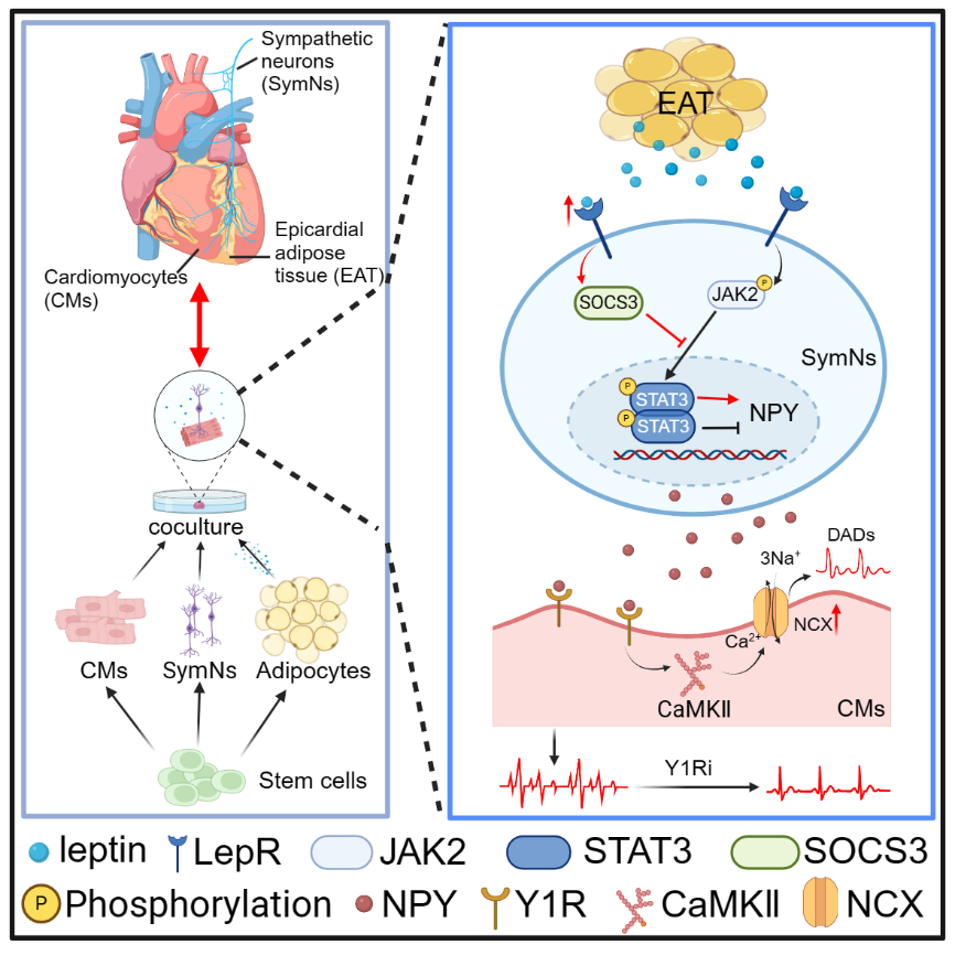 心律失常(Arrhythmia)影响着全球超过1200万人,且发病率也在不断上升,是心源性猝死的主要原因之一。心律失常诱发因素众多,研究表明交感神经系统(Sympathetic nervous system, SNS)活动异常和心外膜脂肪(Epicardial adipose tissue, EAT)增厚是心律失常发生的重要的独立风险因素。心外膜脂肪包绕着大部分心脏交感神经,两者特殊的位置关系提示心外膜脂肪和心交感神经之间的相互作用可能在心律失常发生中扮演重要的角色。然而,由于物种差异和伦理限制,目前尚无直接证据证明脂肪-交感神经相互作用参与心律失常的发生。