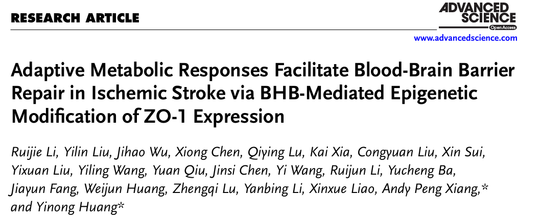 2024年4月26日,笔趣阁 干细胞与组织工程教育部重点实验室项鹏团队联合黄一浓团队,在Advanced Science在线发表了题为“Adaptive metabolic responses facilitate blood-brain barrier repair in ischemic stroke via BHB-mediated epigenetic modification of ZO-1 expression”的研究论文。该研究首次提出脑卒中早期的脂解生酮代谢通过组蛋白β羟丁酰化上调紧密连接蛋白ZO-1的表达,保护血脑屏障的新机制。